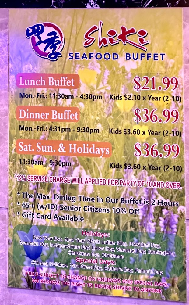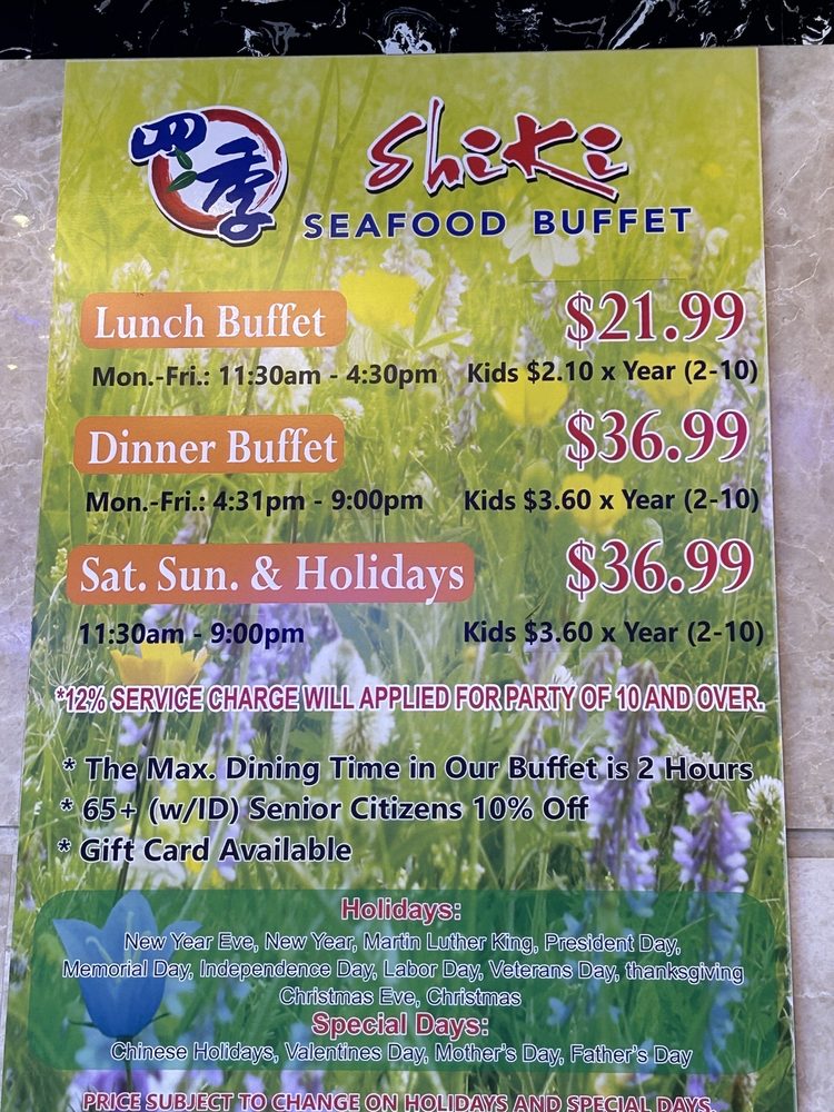 Shiki Seafood Buffet offers a wide array of seafood options in a vibrant, club-like atmosphere. The exquisite selection includes fresh oysters, buttery crab legs, and succulent Alaskan king crab legs. The menu also features a variety of seafood dishes like prawns, fried crabs, crawfish, and salmon. Guests can enjoy a Korean corner, a seafood boil chafer, and a diverse dessert selection with 16 different ice cream flavors. The buffet provides self-serve options, attentive service, and spacious dining areas. Overall, Shiki Seafood Buffet stands out for its all-you-can-eat seafood experience, clean facilities, and attentive staff. It is a must-visit destination for seafood lovers looking for quality and variety in Temple City, CA.
